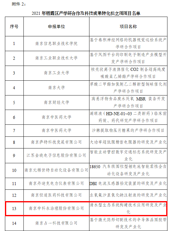 近日,我司科研項目《清水型生態(tài)系統(tǒng)構建技術應用研發(fā)及產業(yè)化》成功申報2021年棲霞區(qū)科技成果轉化項目。這是公司在科研方面的持續(xù)投入及創(chuàng)新能力的不斷提升,也是對公司研發(fā)實力的肯定。