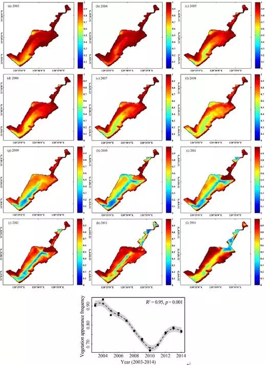 論文首先基于1998-2014年東太湖水環(huán)境參數(shù)長期定位觀測數(shù)據(jù)發(fā)現(xiàn),東太湖生境呈現(xiàn)氮磷營養(yǎng)鹽、懸浮物和藻類水生物顯著增加,透明度顯著下降,湖泊長期處于高水位運行,湖泊生境條件越來越不利于水生植物生長。2003-2014年 MODIS 影像揭示的水生植被出現(xiàn)頻次逐漸降低,水生植被低頻次水域也在逐漸擴大,水生植被和生態(tài)系統(tǒng)呈現(xiàn)快速退化趨勢。統(tǒng)計分析和分類回歸樹模型揭示,在總氮、總磷、溶解性總氮、溶解性總磷、氨態(tài)氮、葉綠素a、懸浮物、透明度、水位等生境因子中,氨態(tài)氮濃度(反映富營養(yǎng)化水平)、透明度與水位比值(反映水下光照強度)對水生植被出現(xiàn)頻次的解釋率高達60.1%,是決定東太湖水生植被消退的決定性因子。因此,減少營養(yǎng)鹽特別氨態(tài)氮輸入,在水生植物萌發(fā)的春季降低湖泊水位都可以有效地促進水生植物發(fā)育和生長,以上研究結果可以用于指導我國受損湖泊生態(tài)系統(tǒng)進行以水生植物重建為主導的湖泊生態(tài)修復。